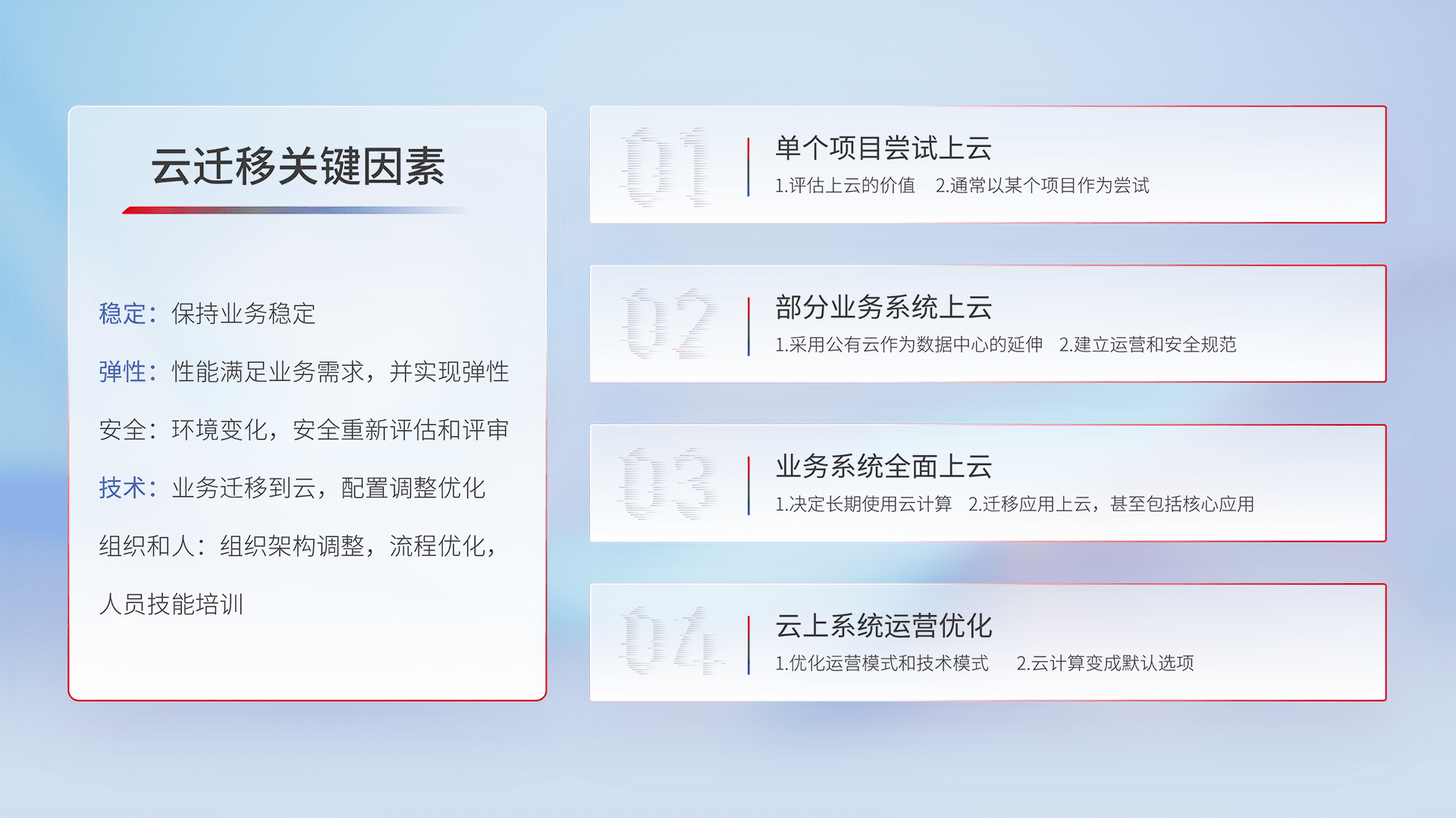 结合实际业务,,从规划设计、、、云平台选型、、、、云原生改造、、数据迁移、、、集成交付,,迁移全过程为客户识别最佳上云路径,,做好风险识别管理,,,设计网络架构、、、身份权限、、、、安全审计合规、、、、操作审计、、日志审计、、、监控告警策略、、、、多站点容灾设计等,,,,对云上基础设施进行整体规划,,,,提升IT治理水平,,,以满足弹性、、高可用、、高性能的需求。。。