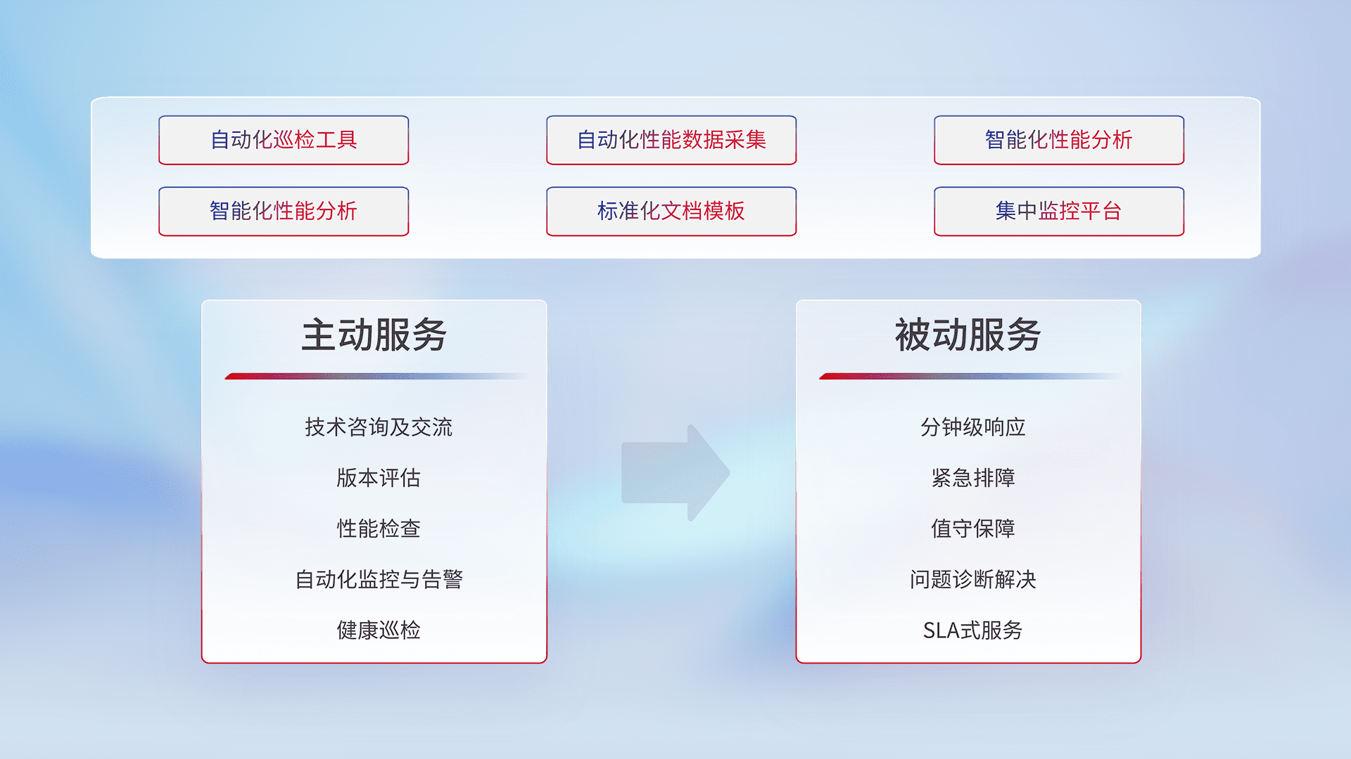 智能化工具和标准化文档,,,,保障服务质量,,提供主动服务(包含技术咨询、、、版本评估、、性能检查、、、、自动化监控与告警、、、、健康巡检)和被动服务包含(分钟级响应、、、紧急排障、、、、值守保障、、问题诊断解决、、、SLA服务)。。。。